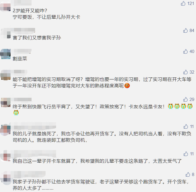 毕竟,货运行业对年轻人的吸引力越来越弱,在一些地区甚至出现了货车司机人员不足的情况。但对此,卡友们的看法出奇的一致:尽管国家放宽了对人员的限制,但在老司机眼里,让后辈开大车不是一个好的选择……